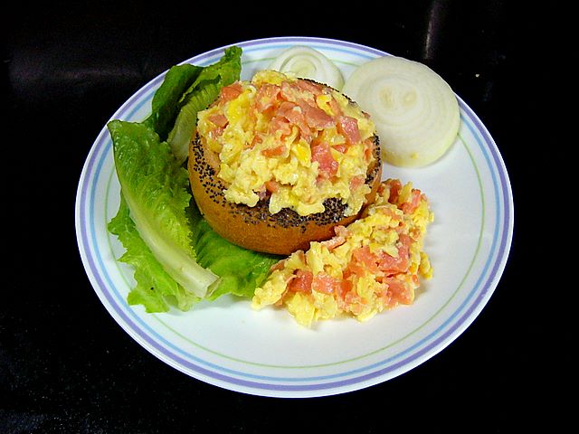 พอไข่สุกประมาณ 50% ให้เทแซลมอนรมควันที่คลุกครี